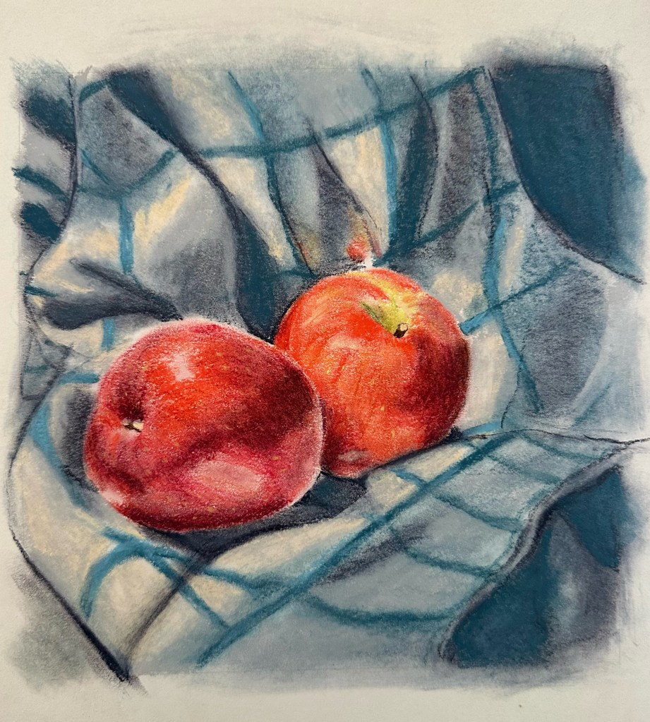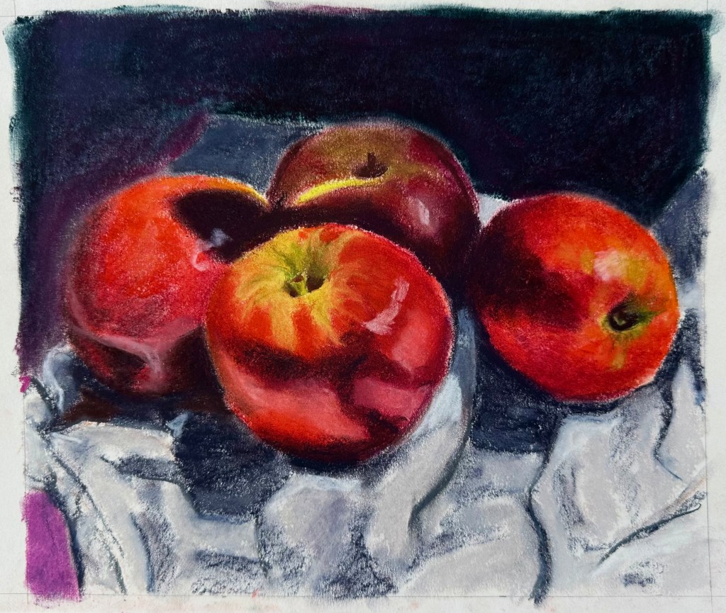 AVAILABLE – “Apples on cloth” hard pastel on paper 8×10